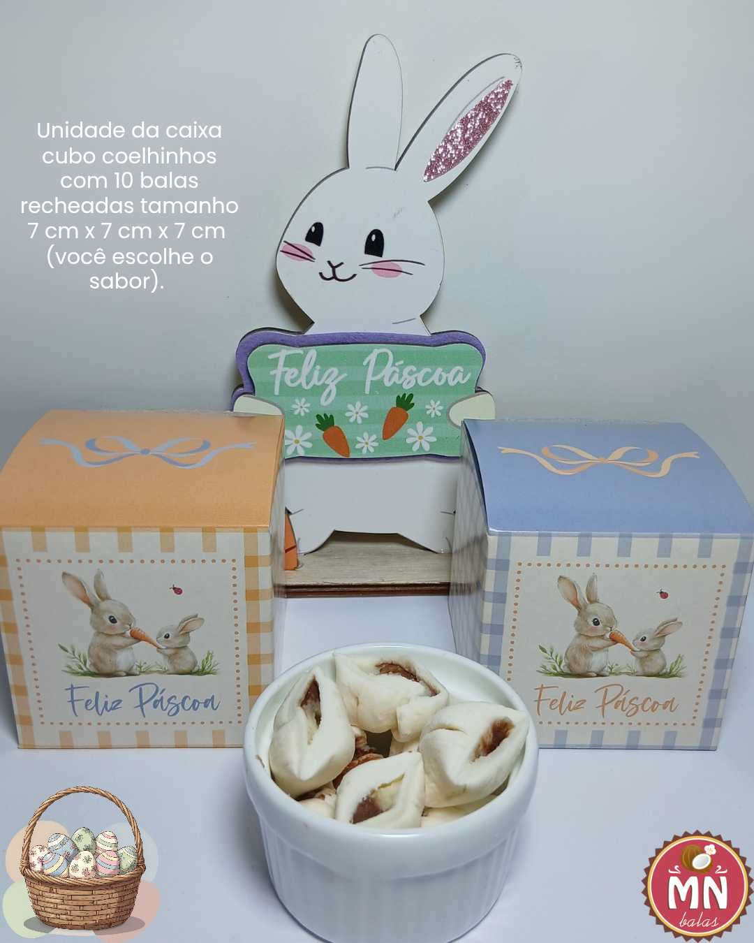 Unidade da caixa cubo coelhinhos com 10 balas recheadas tamanho 7 cm x 7 cm x 7 cm