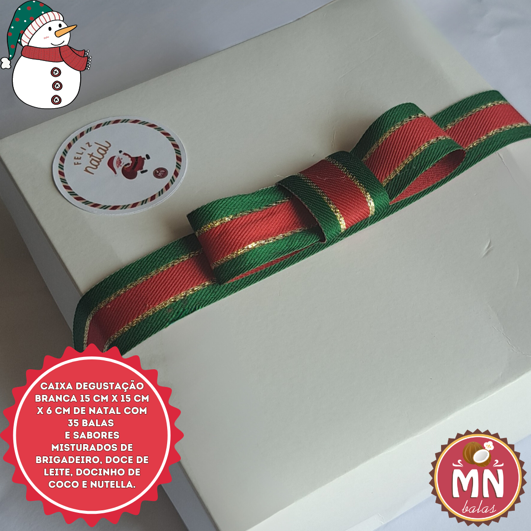 Unidade da caixa DEGUSTAÇÃO NATAL branca 15 cm x 15 cm x 6 cm de natal com 35 balas e sabores misturados de Brigadeiro, doce de leite, docinho de coco e nutella